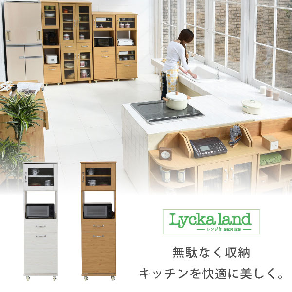 関連商品 シリーズ一覧 【Lycka land スリムキッチンラック】 レンジ台タイプ 隙間タイプ 高さ120cm 隙間タイプ 高さ180cm ペールワゴンタイプ 高さ120cm ペールワゴンタイプ 高さ156cm レンジラック 詳細・スペック 商品説明 木目調とガラスのカントリーテイストが可愛いリュッカランドのキッチンシリーズ。